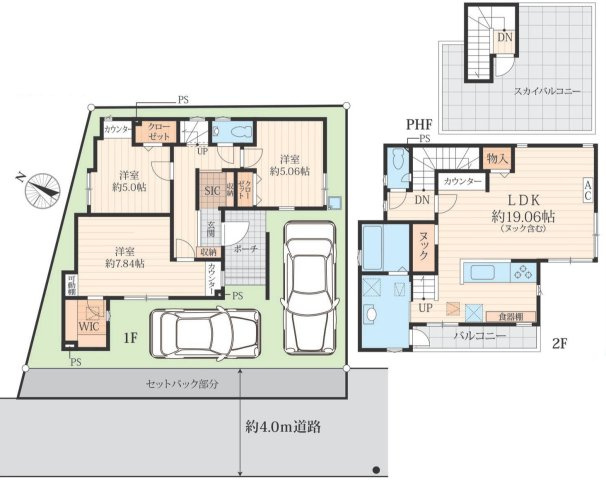 敷地面積44坪超を確保した、ZEH水準の省エネ性能を持つ新築住宅です。東南向きで日当たりが良く、庭や並列2台分のカースペースを備えています。各居室に収納を配置した4LDKの間取りで、家事動線にも配慮された設計です。
