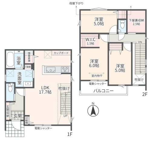 2階に配置された約17.2帖のLDKは、採光に配慮された設計となっています。L字型の対面キッチンにはパントリーを併設。主寝室は約9.5帖あり、将来的に間取りの変更が可能な「未来壁」プランを採用した新築住宅です。