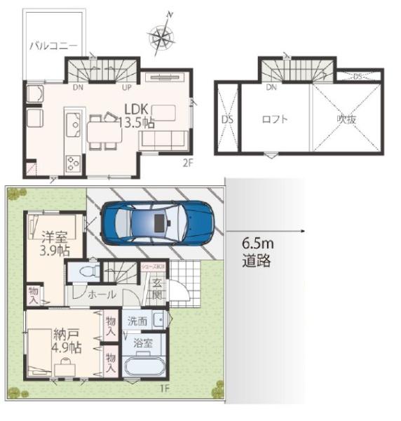 南側が隣地通路となっているため、陽当たりが確保された新築一戸建てです。リビングには吹き抜けが設けられており、開放感のある空間となっています。固定階段で利用できるロフトのほか、床暖房や浴室乾燥機といった日々の生活を支える設備が導入されています。