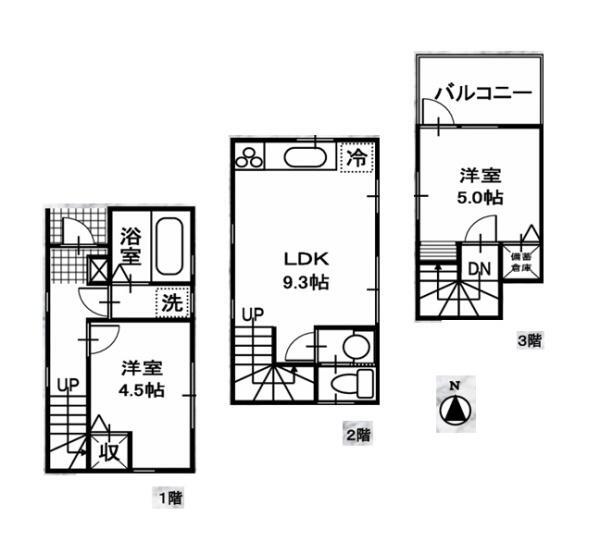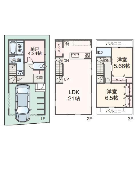 125㎡(37坪)超の敷地面積を確保した、3SLDKの新築一戸建てです。2階リビングプランの採用により、採光や開放感を得やすい設計となっています。キッチンはリビングを見渡せる対面式となっており、生活動線に配慮した間取りが特徴です。